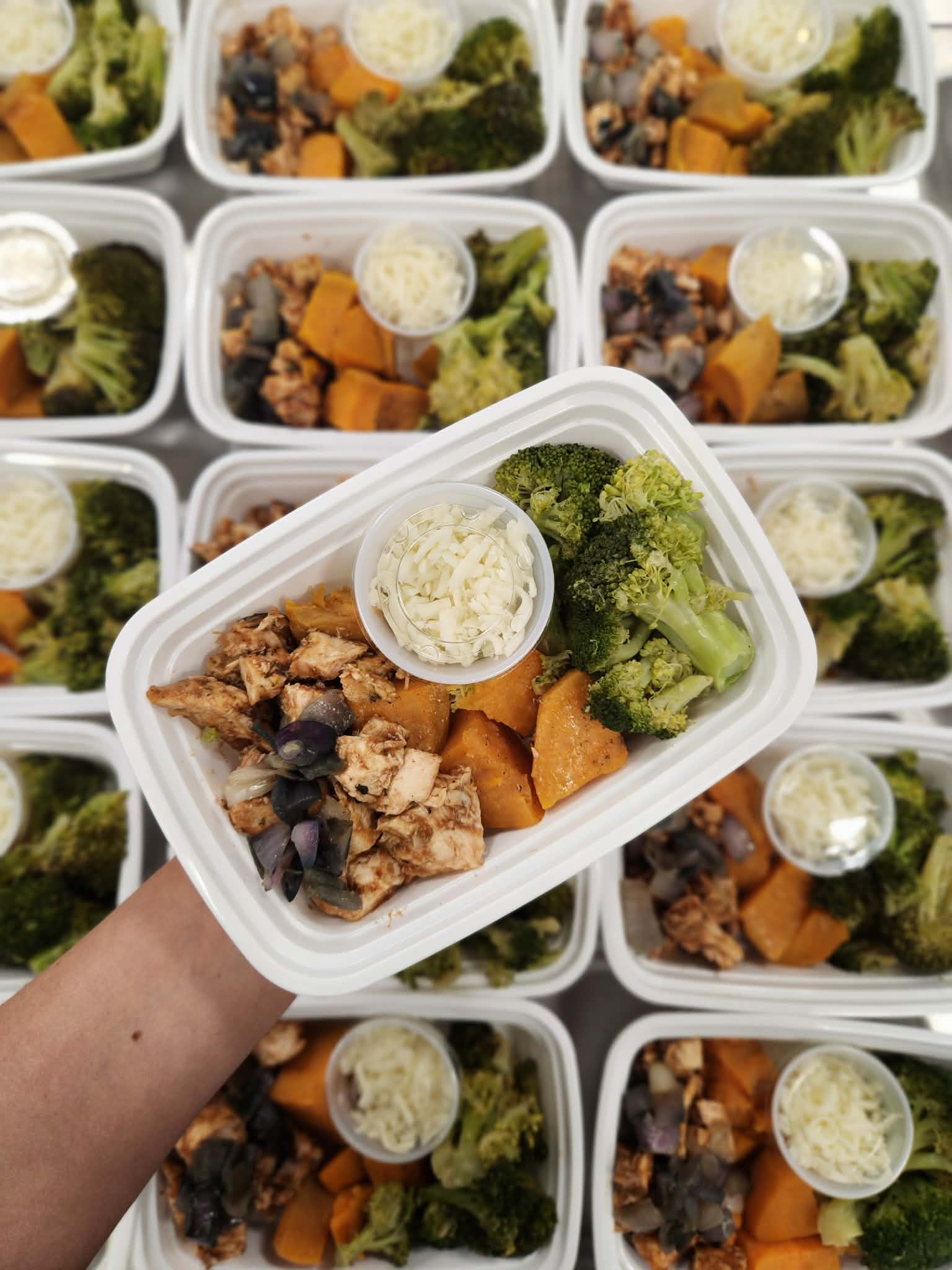 chicken with seasonings coated in sugar-free bbq sauce with purple onions, roasted sweet potatoes and broccoli