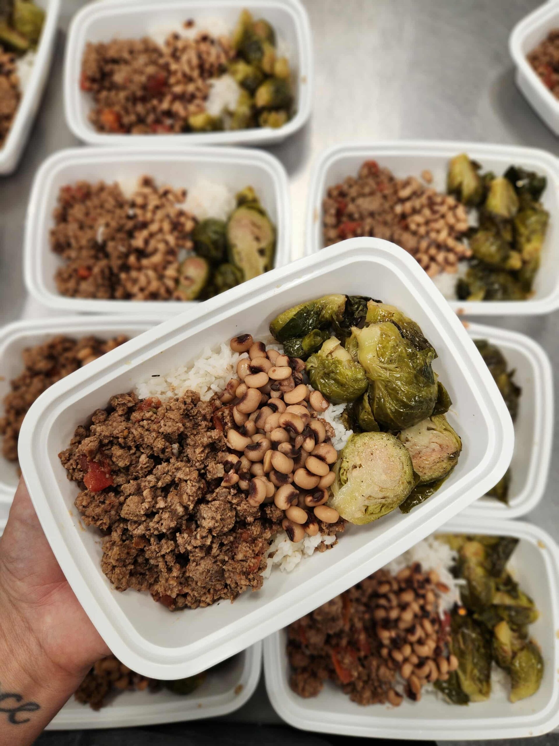 Beef and tomatoes over rice with black eyed peas and our sweetened roasted brussels
