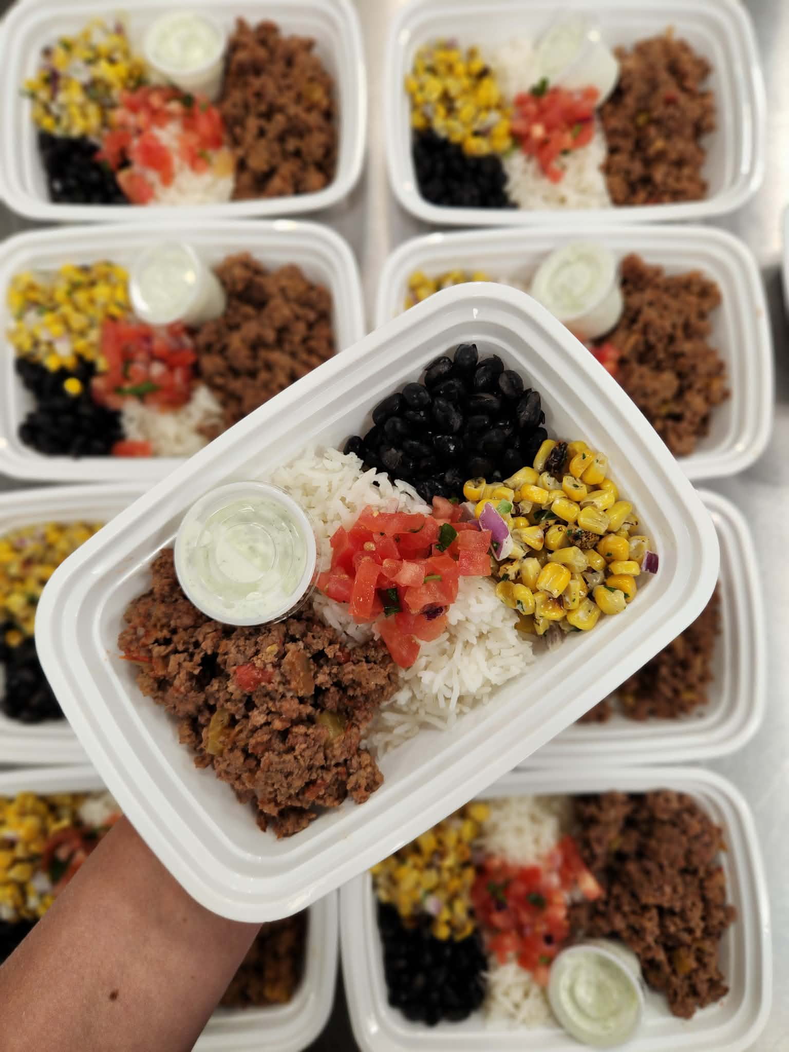 ground beef over rice with black beans, street corn, pico and cilantro lime sauce
