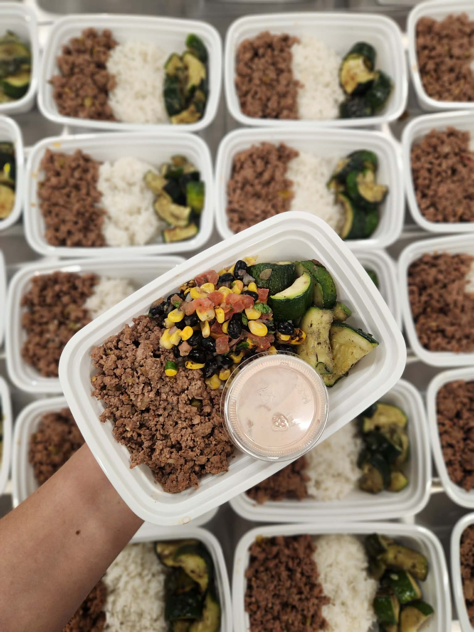 ground beef over rice with black bean, corn, tomato salsa served with zucchini and creamy salsa