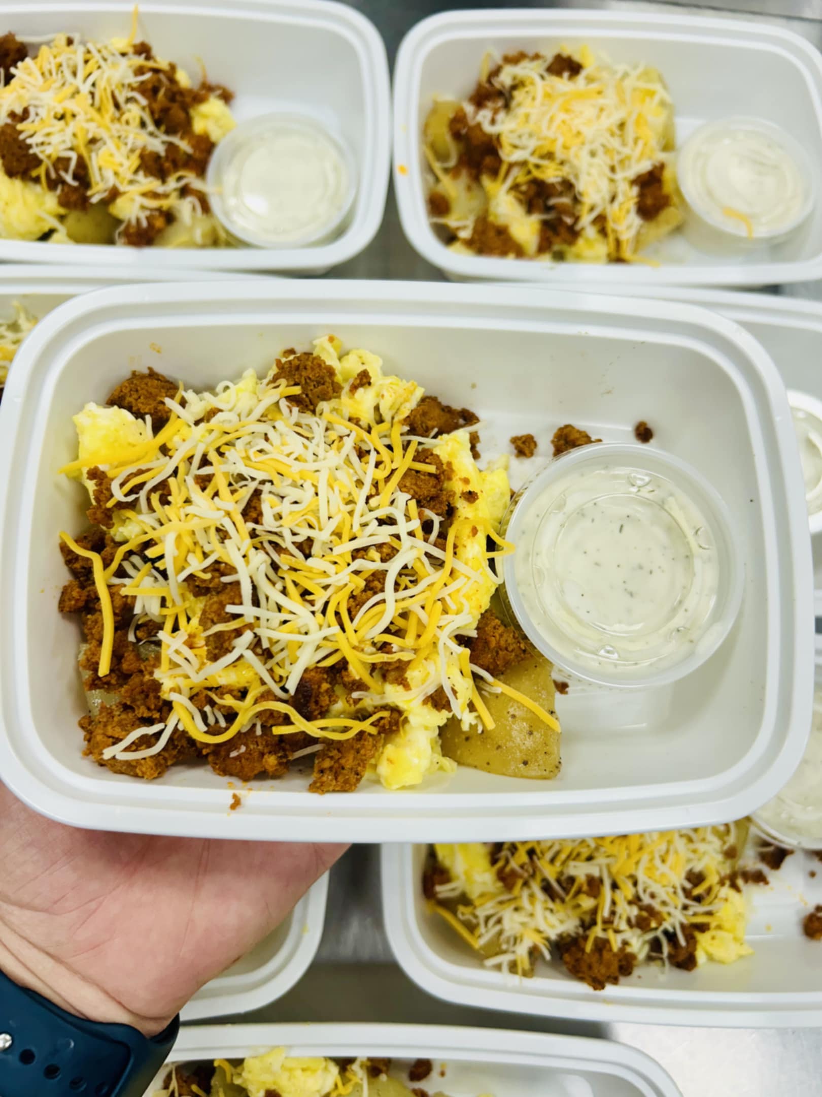 roasted potatoes, eggs, salsa beef and cheese in a stack served with our protein ranch