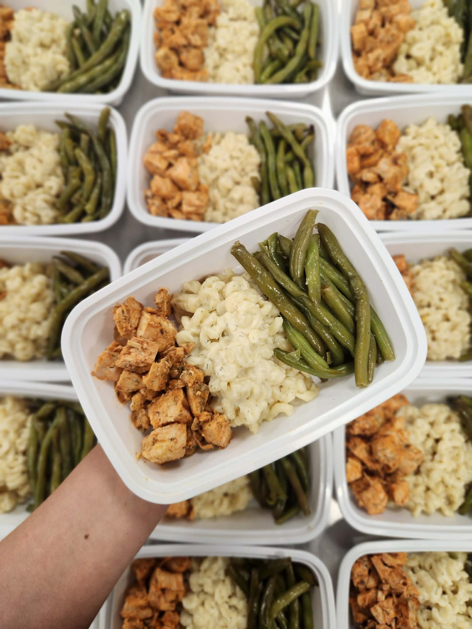 Grilled chicken with buffalo sauce served next to our homestyle mac and cheese and roasted green beans.