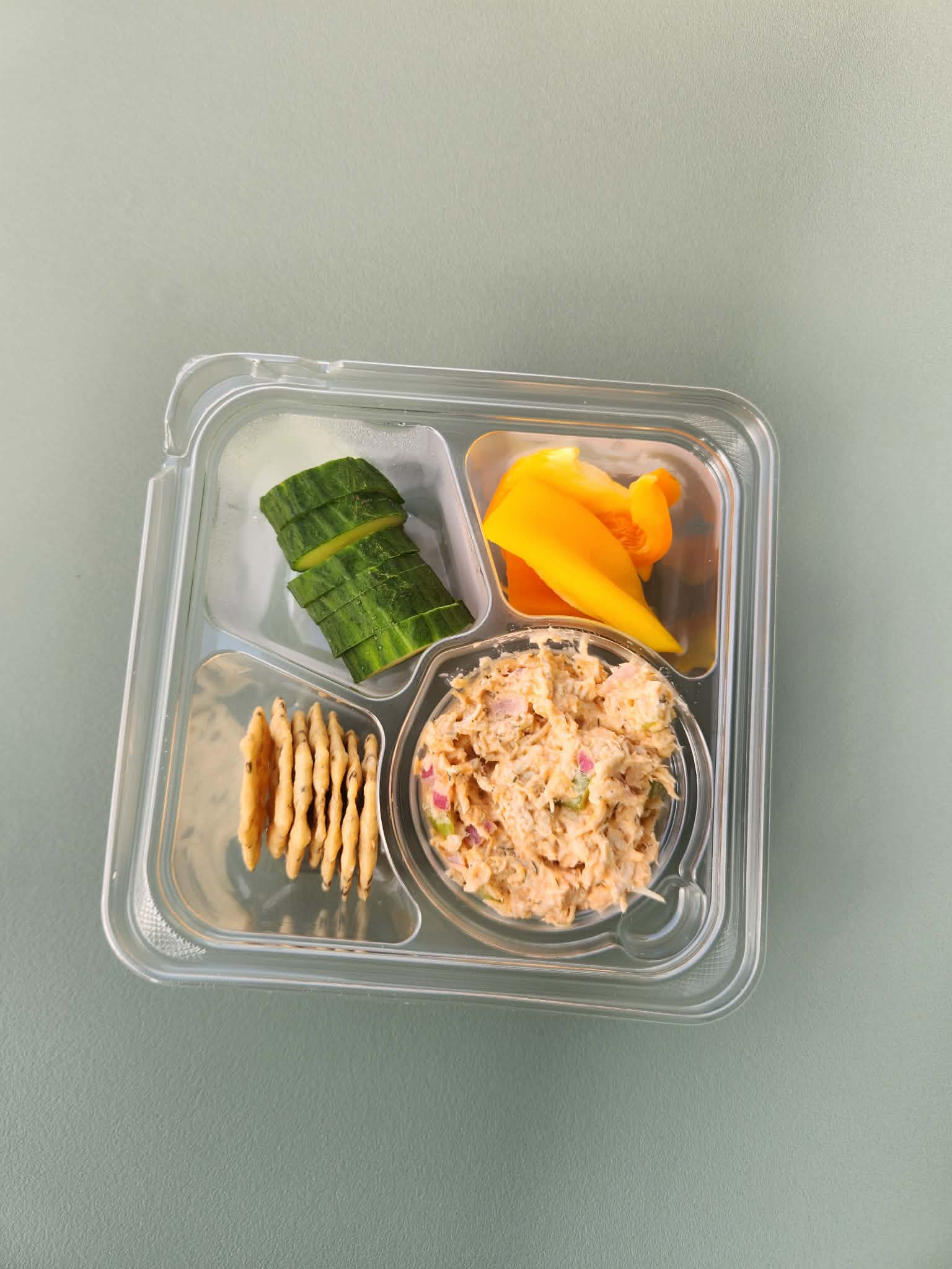 our house buffalo chicken salad served with cucumbers, bell peppers and gluten free crackers