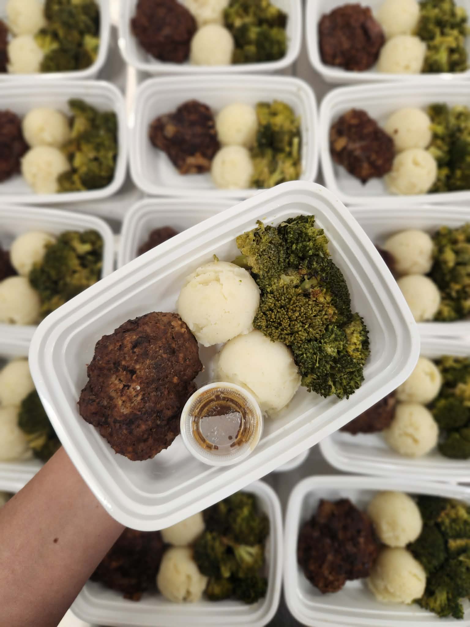 Our housemade hamburger steak with mashed potatoes and roasted broccoli.