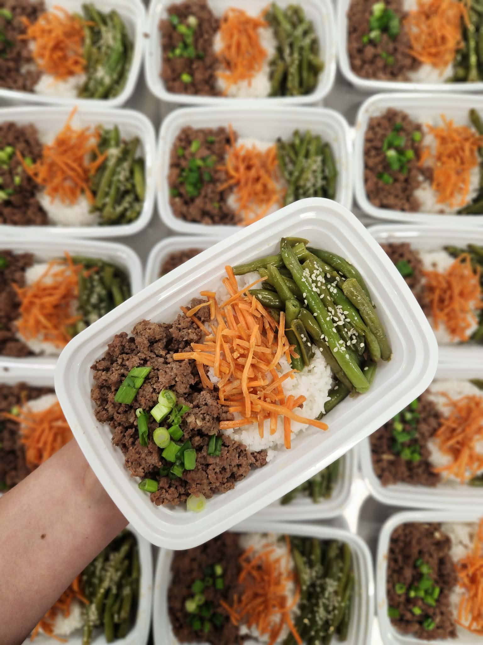 ginger, soy sauce, garlic and honey seasoned beef and carrots over basmati rice with a side of sesame green beans