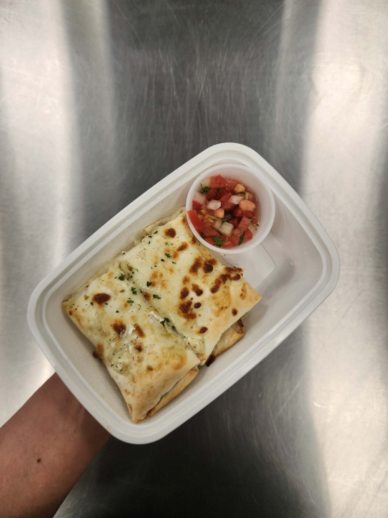 salsa verde chicken, black beans and mozzarella rolled in a low carb, high fiber tortilla with a side of fresh pico