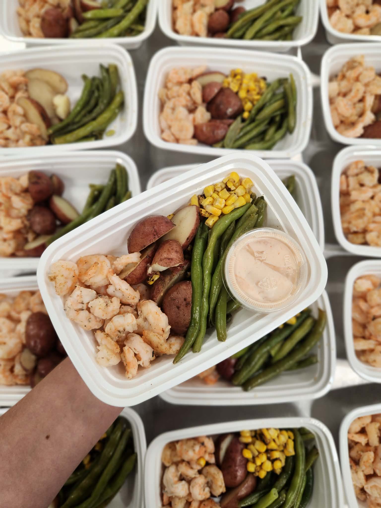 grilled shrimp, red potatoes, corn, green beans and our house shrimp boil dipping sauce