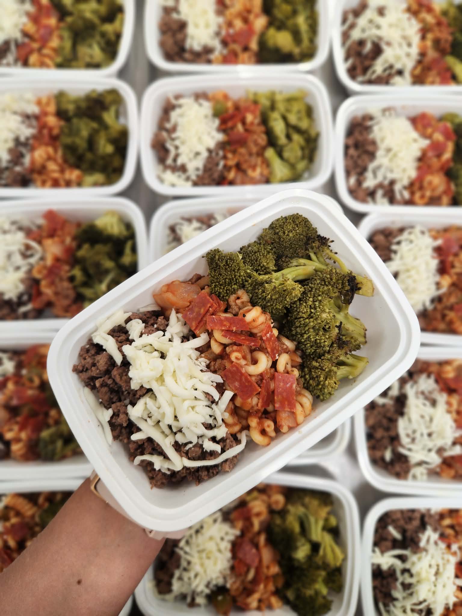 our favorite pizza toppings (beef, sausage, pepperoni, bell peppers, onions) and Italian seasonings served over noodles topped with mozzarella cheese with a side of roasted broccoli