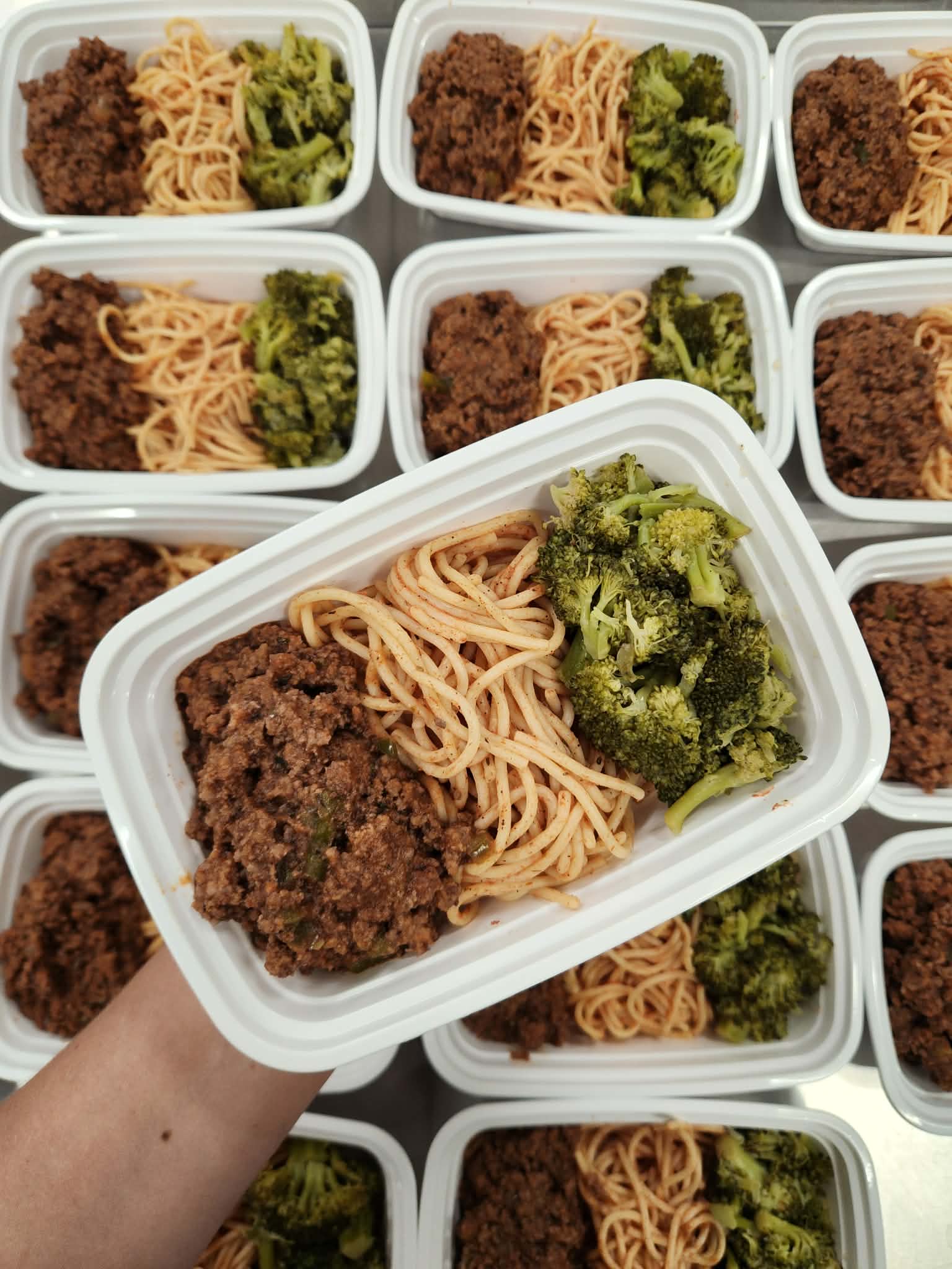 Spaghetti with meat sauce served with garlic flavored broccoli on the side